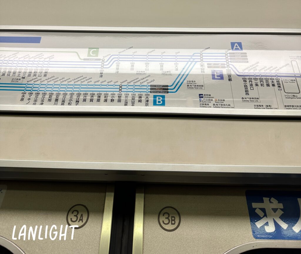 如果你用google地圖查京都車站到琵琶湖綠水亭,選大眾交通工具,會出現要你坐A東海道、山陽本線以及/或B湖西線。但是指示牌上就是找不到這2條線的名子,到底是哪一條呢?入口在哪呢?不用擔心,指的就是下圖這個A跟B,所以還是一樣從主要大入口進去(烏丸中央口),往近江舞子/近江金津的方向。