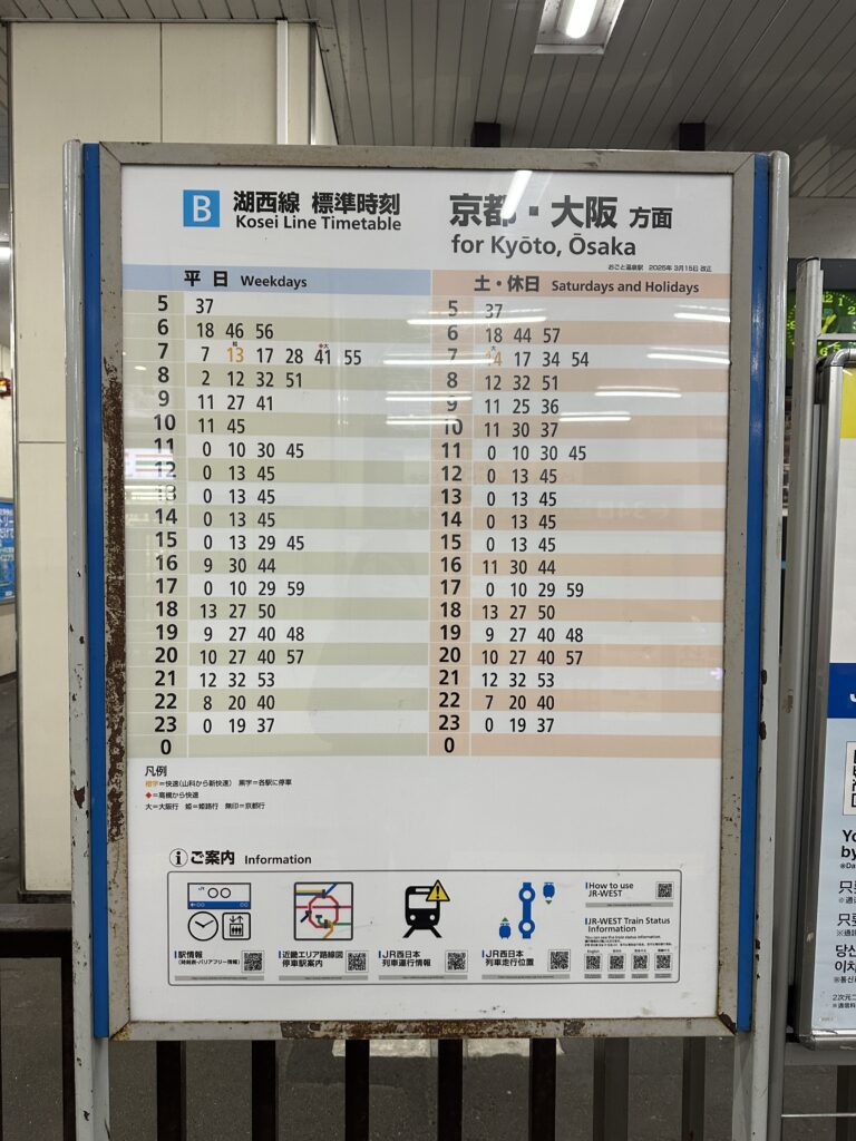 車站出來就有回京都的時刻表,先拍起來,非常有用,看看明天要搭哪一班車回京都。