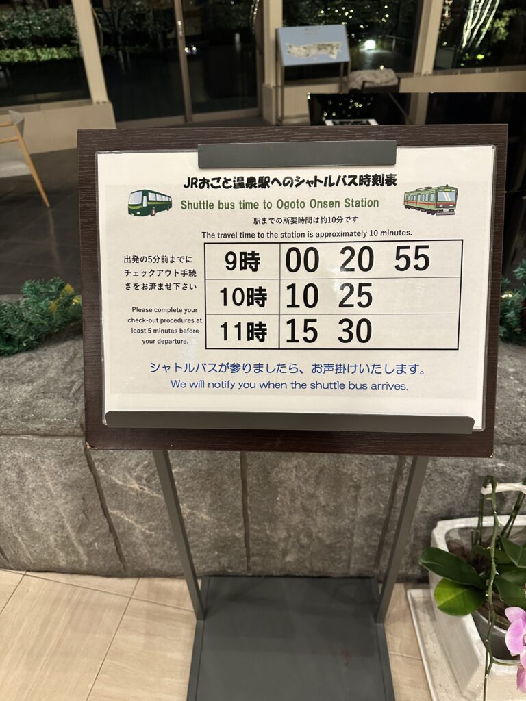 一進門就有牌子跟你說明天早上接駁到車站的時刻表,很方便。10點退房,若還想晃一下再去車站也是沒問題的。