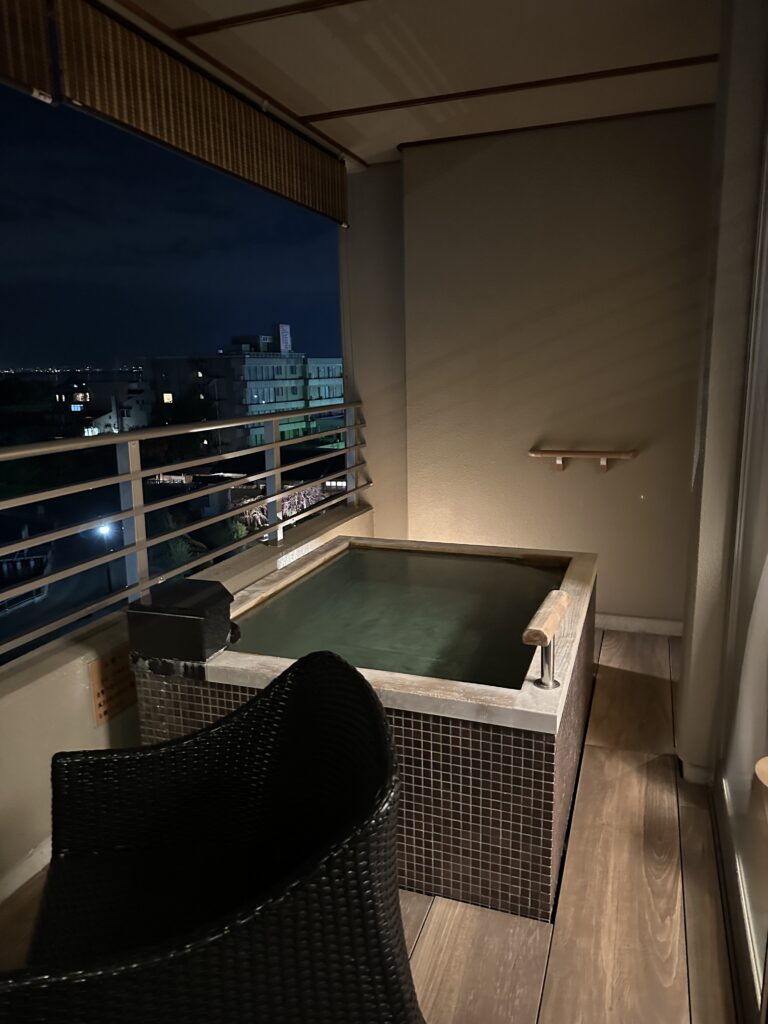 能在自己房間泡湯,看著琵琶湖,真是太幸福了~!沒有水龍頭開關,水是持續一直流動的,溫度適中,不會燙到無法泡湯。