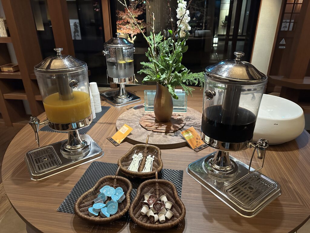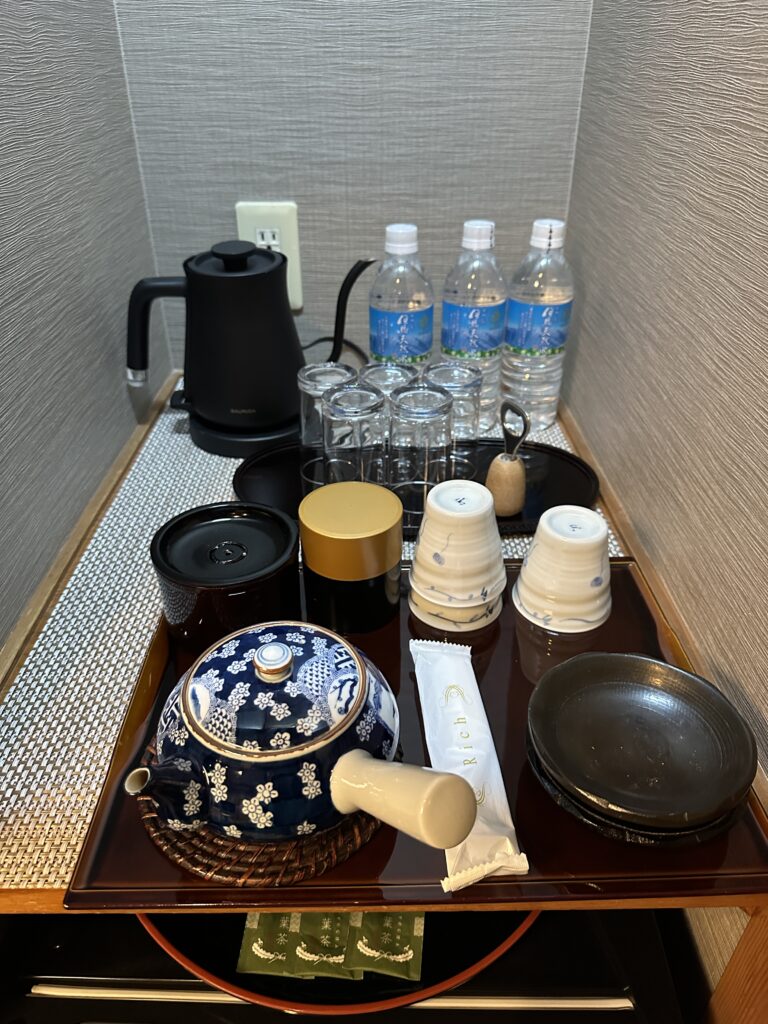 房間裡面也有冰箱,但要記得確認一下,是要自己打開開關還是不需要。像這間,要自己打開,但我們沒注意,還想說怎麼都不冰。冰箱上面有提供小點心、礦泉水、泡茶組、熱水壺,算是該有的都有。