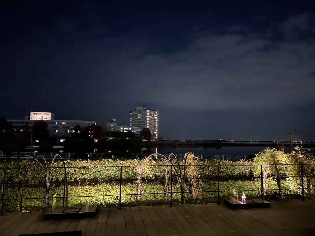 晚上大廳外的沙發區還有真的火光,11月的日本,戶外是稍微有點冷了,逛逛就好。看過去就是日本最大的湖泊,琵琶湖。